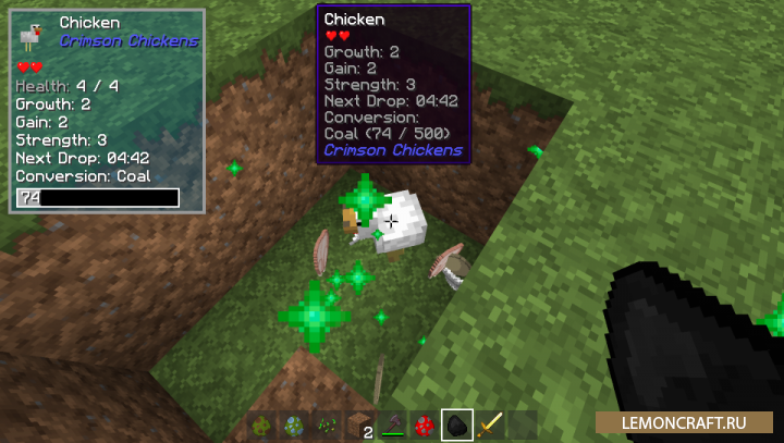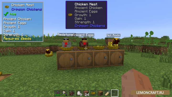 Мод на ресурсных куриц Crimson Chickens добавляет в игру специальные насесты и куриц, которые будут нести различные ресурсы. Есть два варианта завести себе ресурсную курицу, можно найти ее в вашем мире, приручить, начать разводить, а можно просто накормить простую курицу нужным вам ресурсом.